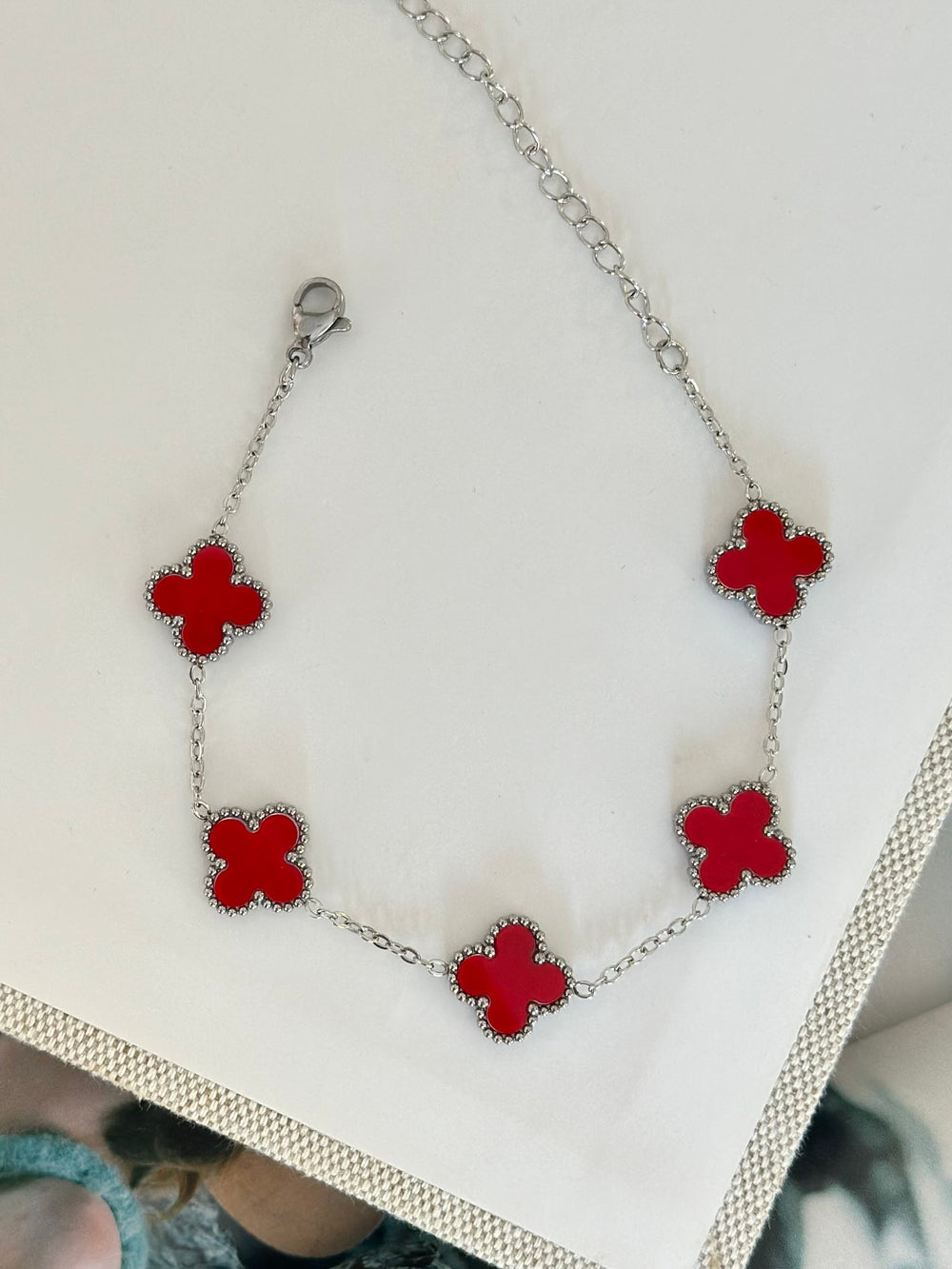 Gümüş Renk Detay Kırmızı Yonca Bileklik