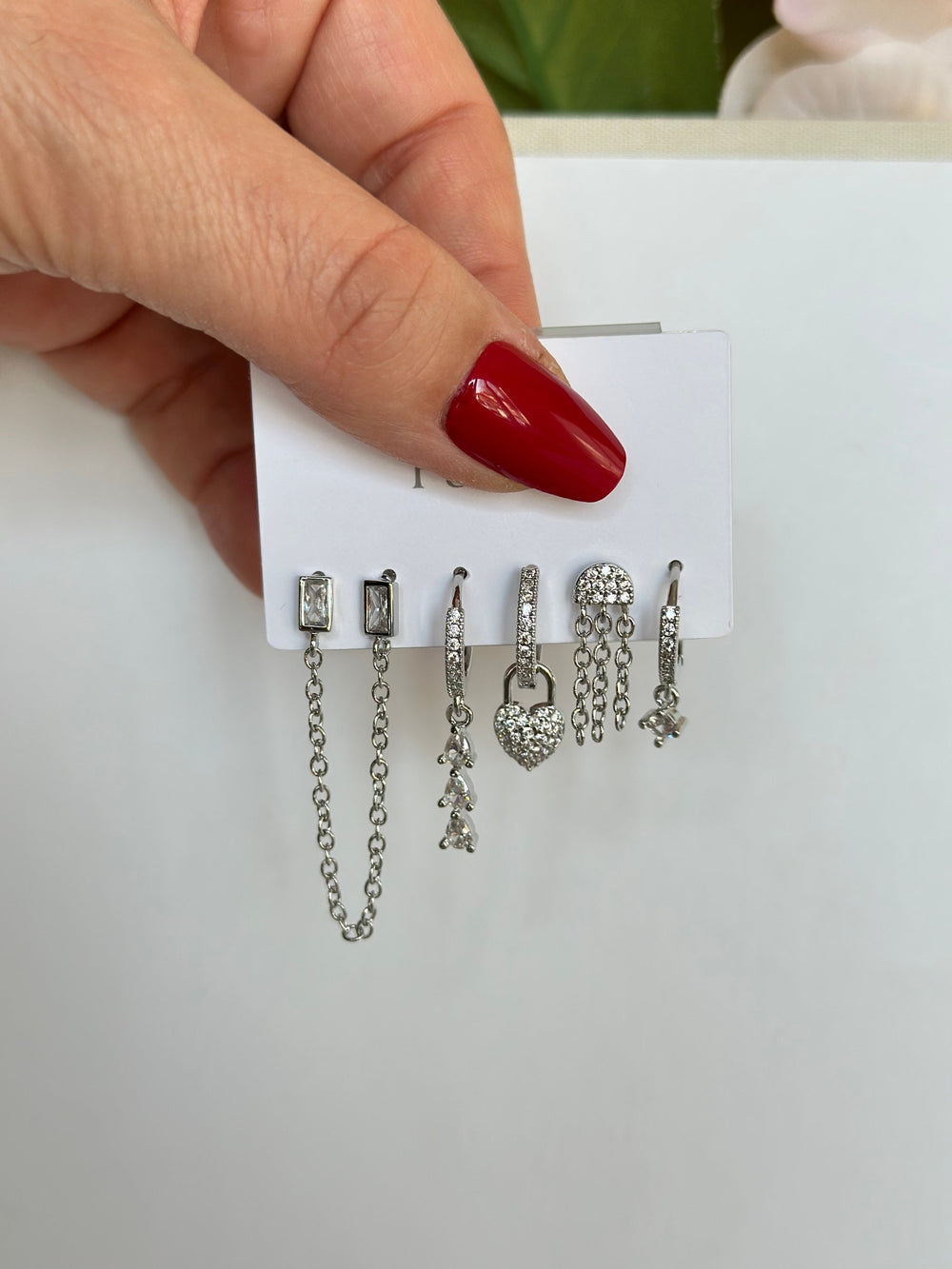 Kalp Detay 6'lı Kombin Gümüş Renk Küpe