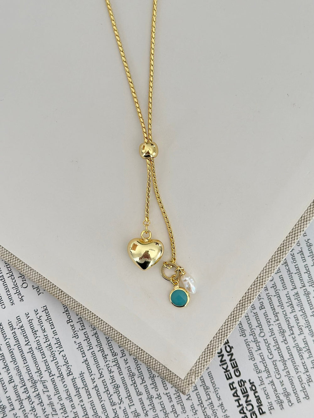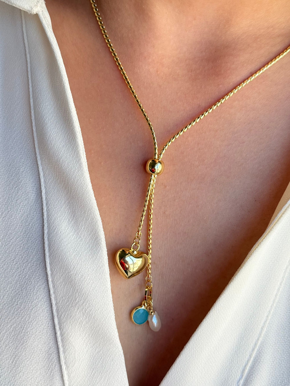 Kalp, İnci ve Turkuaz Charm’lı Ayarlanabilir KolyeAşkın, zarafetin ve enerjinin tek parçada buluştuğu özel bir tasarım…Altın kaplama...